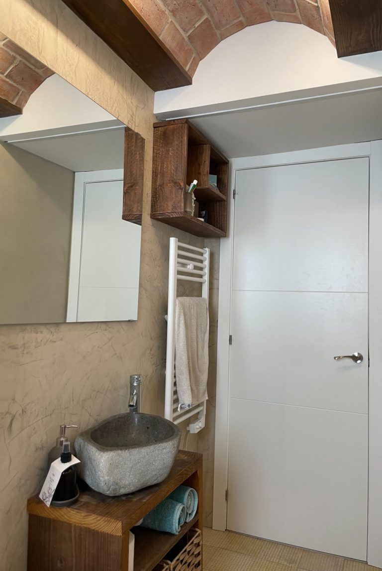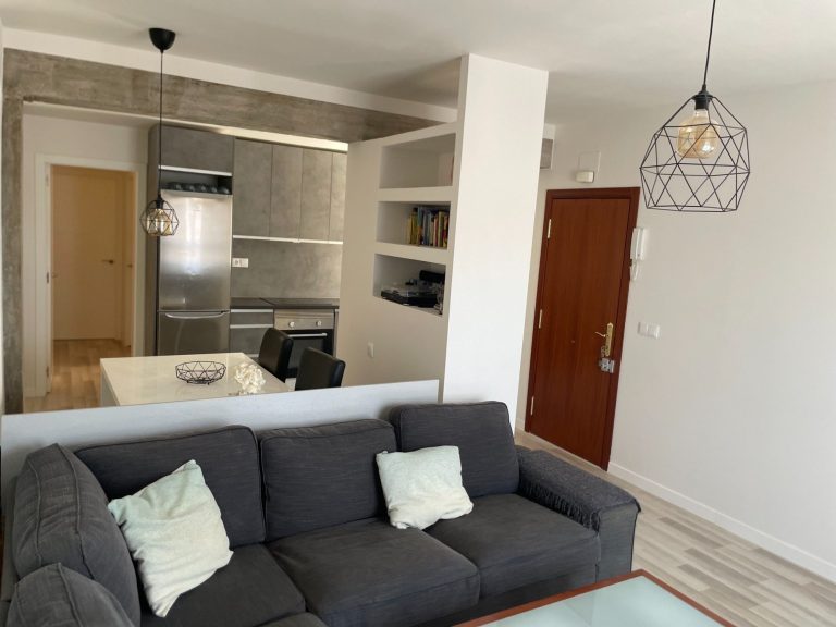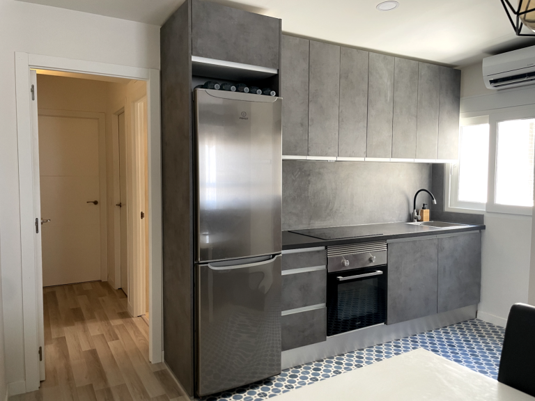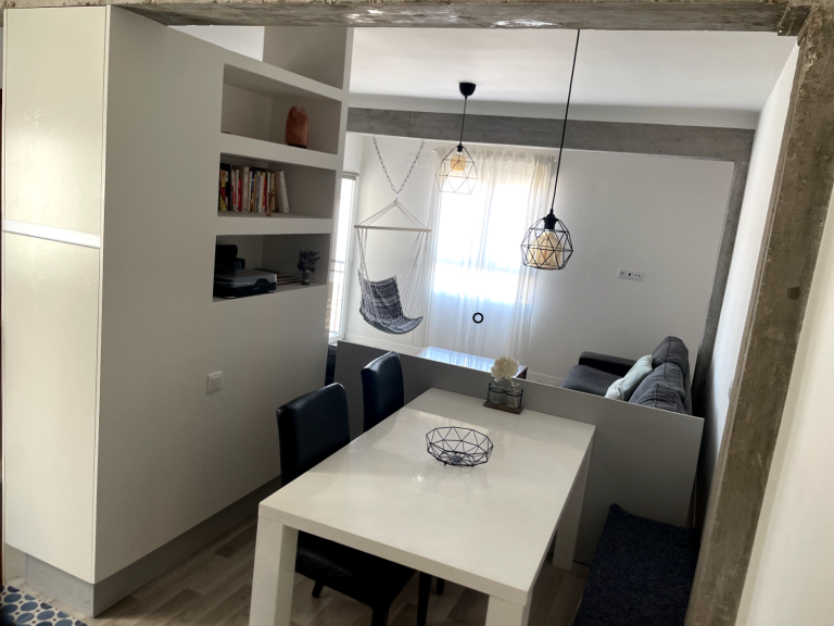El punto de partida fue un largo pasillo que dividía la vivienda y restaba amplitud a las estancias. Para optimizar el espacio, se unificaron el salón-comedor y la cocina, y se reubicó el baño, situándolo junto a la nueva cocina. De esta manera quedó más accesible tanto desde las habitaciones como desde la zona de día.